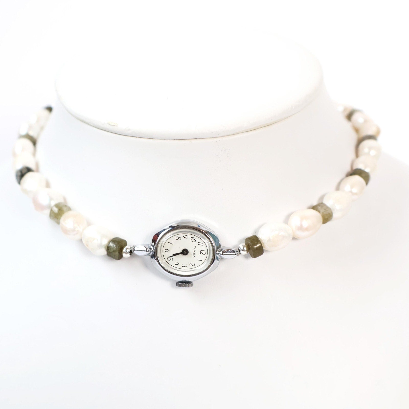 Reworked Labradorite and Pearl Choker Necklace with Vintage Watch Face (Nonworking) | TIMEX