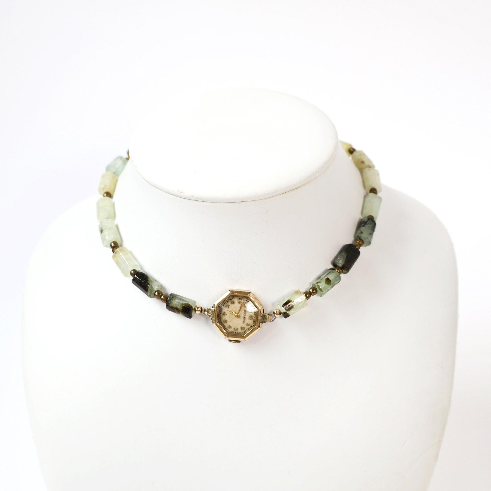Reworked Prehnite Choker Necklace with Vintage Watch Face (Nonworking) | BULOVA
